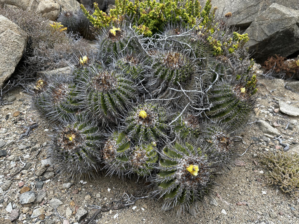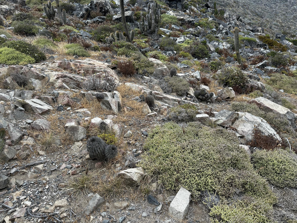 Am zweiten Tag ging es von Los Vilos, wo wir übernachtet hatten, weiter Richtung Norden. Bei El Teniente biegen wir ab von der Ruta 5 und fahren über Feldwege durch ein ausgetrocknetes Flussbett zum Strand. Dort finden wir relativ schnell Copiapoa pendulina. Die Pflanzen wachsen dort zwischen den Felsen und bilden große Polster. Einige Pflanzen sind sogar in Blüte. Neben der Copiapoa finden wir noch zwei andere Eriosycen, diese leider ohne Blüten.