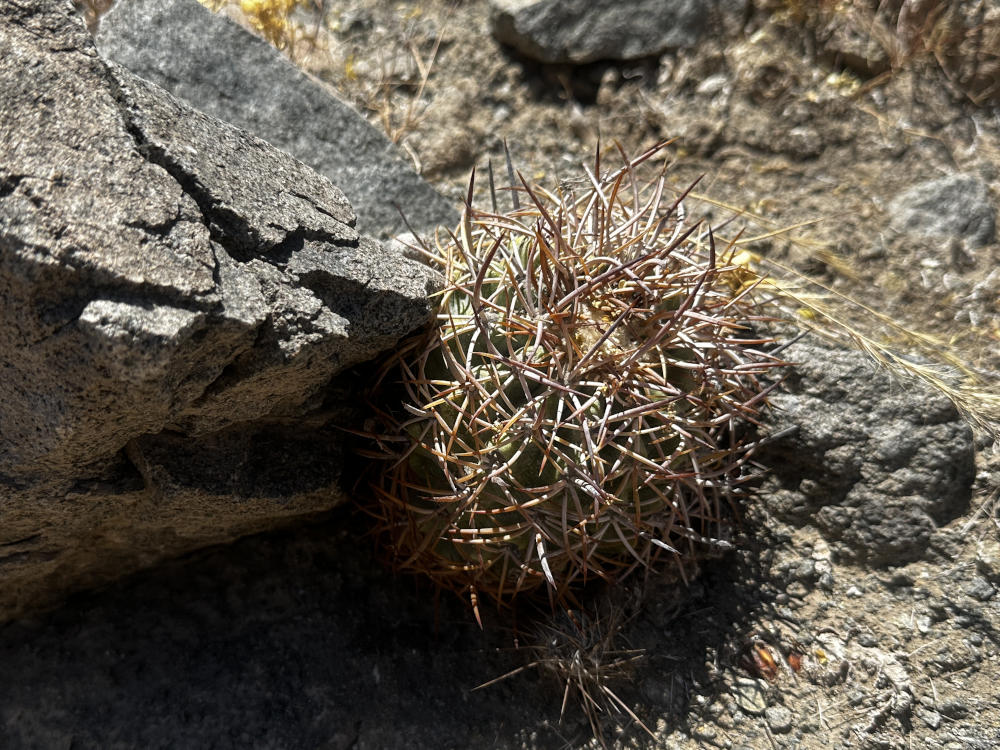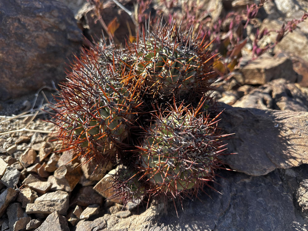 Danach geht es in ein Tal östlich von Vallenar zu einem Standort von Copiapoa rubispina. Schöne Pflanzen, sie ziehen sich über einen ganzen Berghang. Im Gegenlicht sieht man gut, woher sie ihren Namen haben.