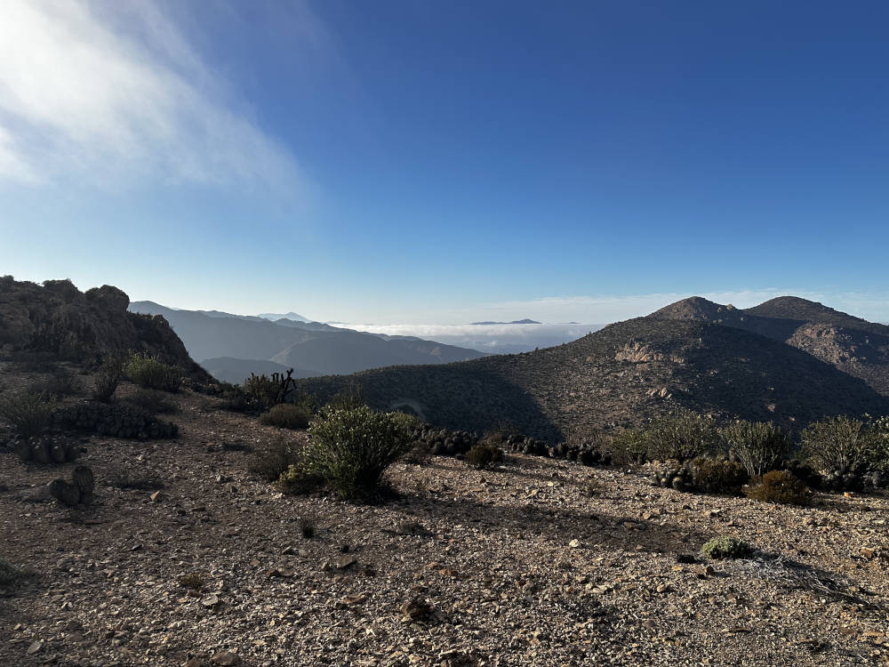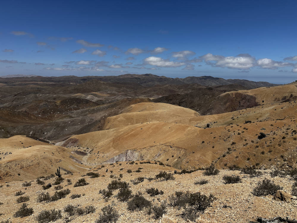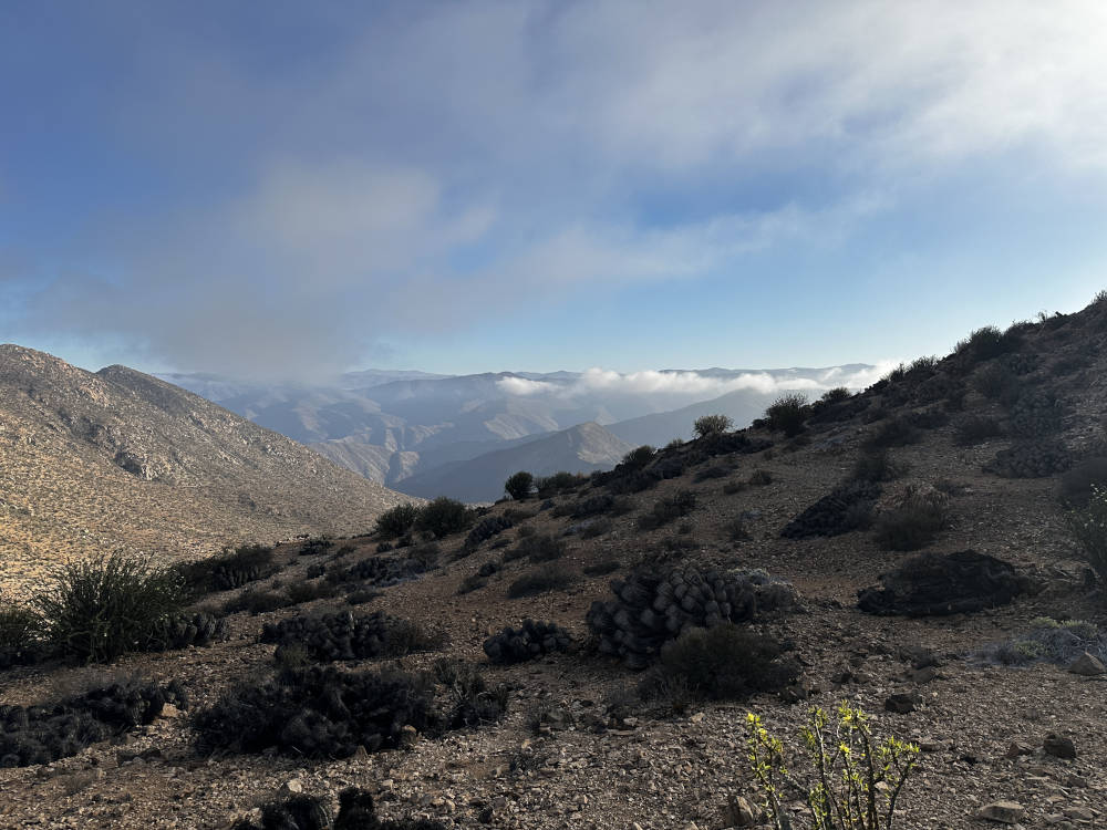 Die Anfahrt erfolgt über anfangs steile, später sehr steile Schotterwege, ein alladgetriebenes Fahrzeug ist hier deutlich zu bevorzugen. In vielen Schleifen geht es immer weiter den Bergzug hoch. Irgendwann sind wir dann auch fast ganz oben und halten an. Die Aussicht ist gut, man kann die in die angrenzenden Täler hereinziehenden Wolken sehen und natürlich auch die großen Polster an Copiapoa cinerea (-Hybriden?).