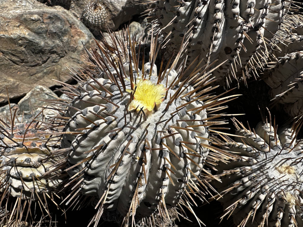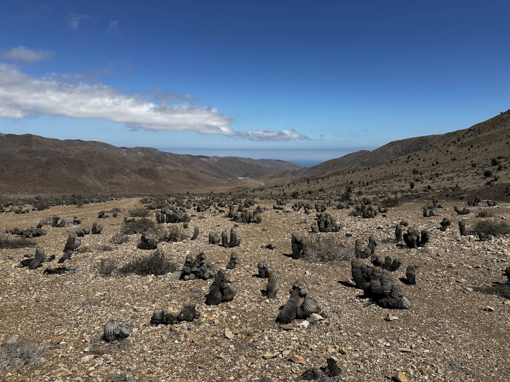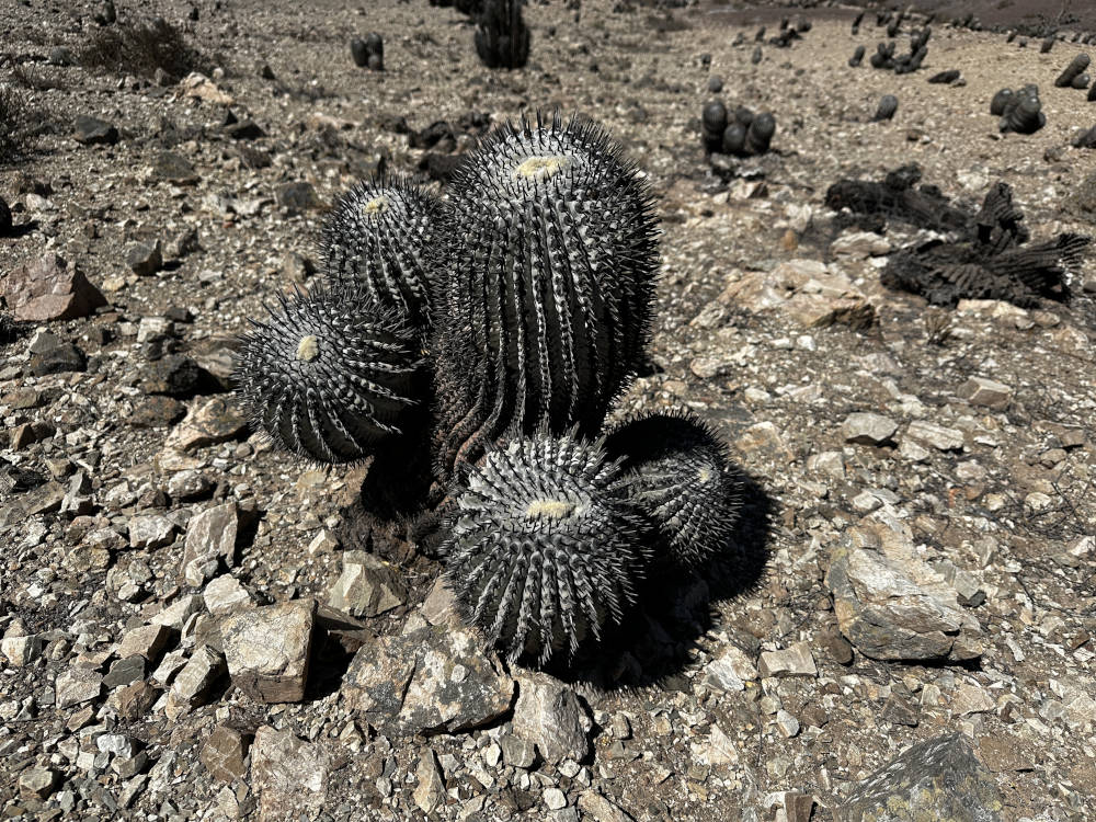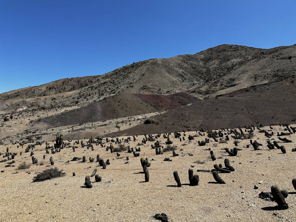 Wir fahren durch eine Gegend mit endlosen Feldern von Copiapoa cinerea. Am Ende eines Weges stellen wir unsere Fahrzeuge ab und laufen zu Fuß weiter. Es geht durch eine Gegend mit unterschiedlich gefärbten Gesteinen und Copiapoa cinerea begleitet uns fast den gesamten Weg. Die Landschaft ist ein wenig unwirklich, aber beeindruckend schön.