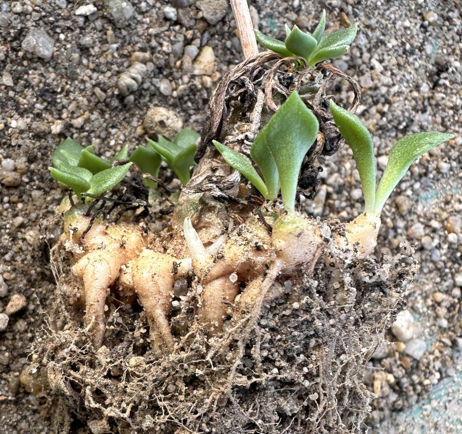 So treibt nun auch Tylecodon ventricosus aus. Zu Beginn waren mir die vielen Vegetationspunkte neben dem Haupttrieb aufgefallen, ich hatte schon Sämlinge vermutetet. Aber mir wurde dann gesagt, das es sich um unterirdische Fortsätze (Stolonen) handelt.