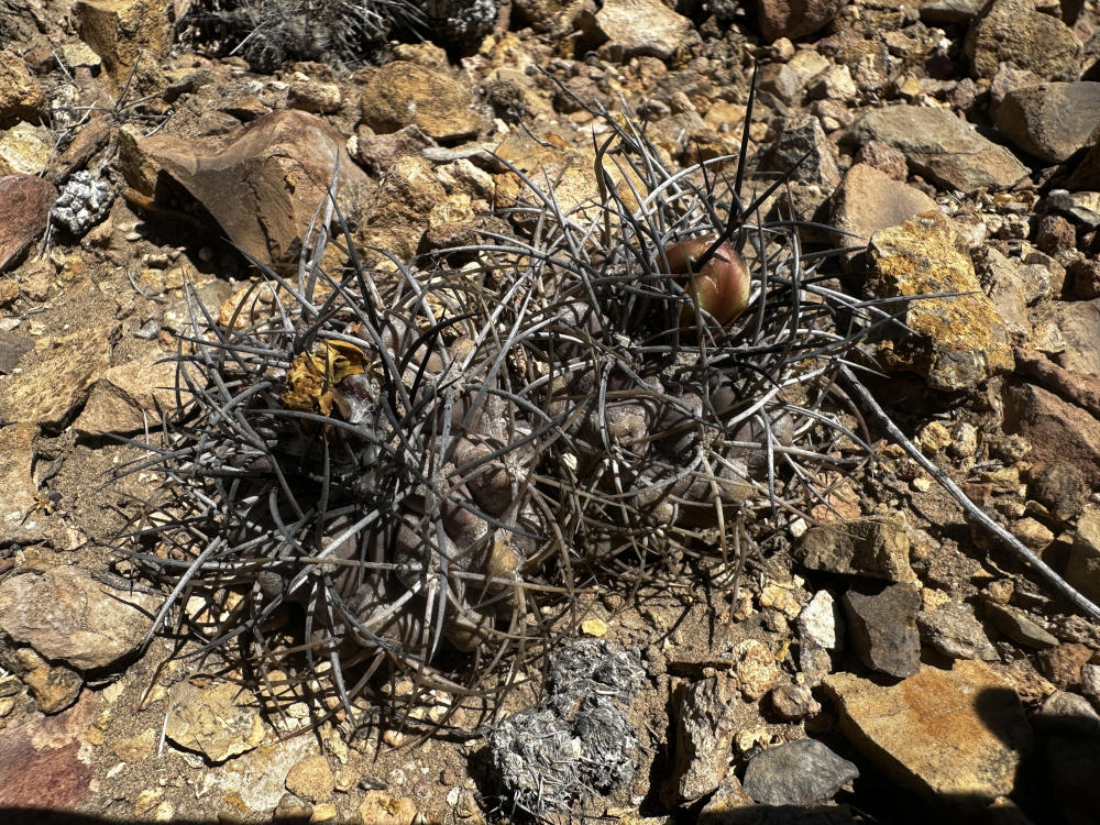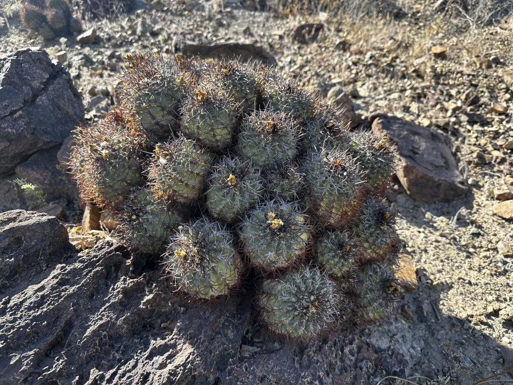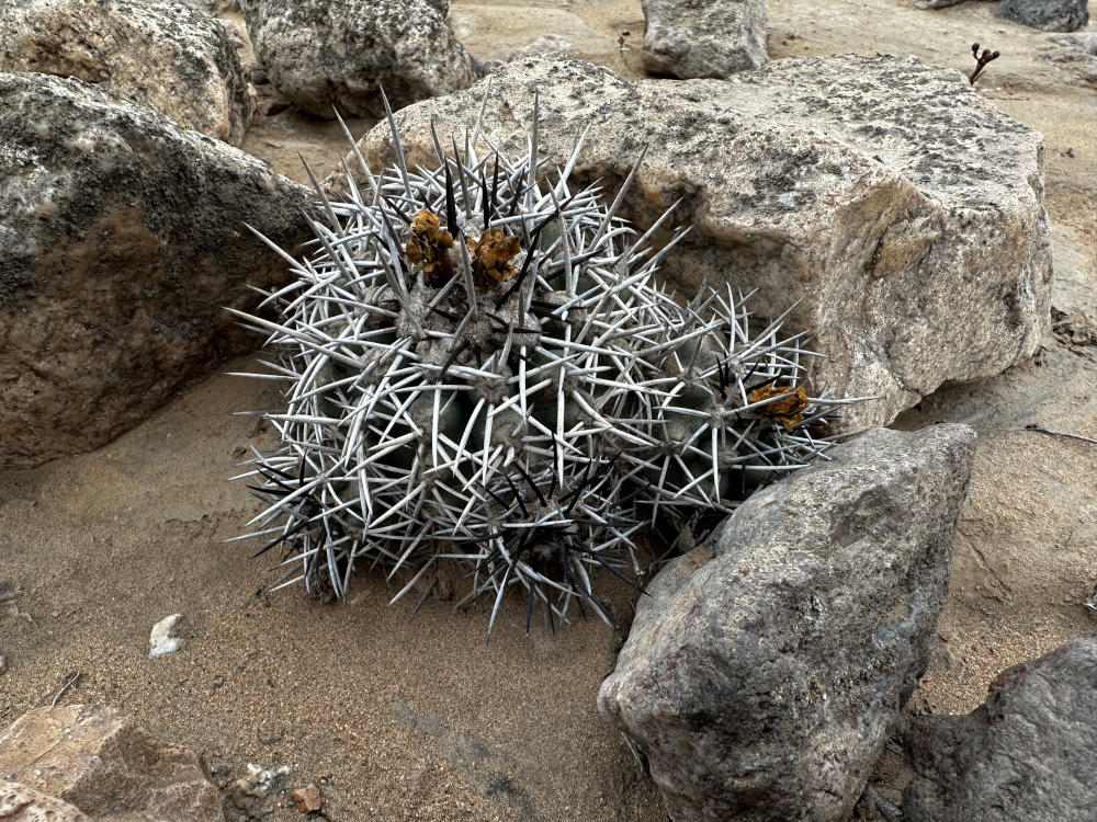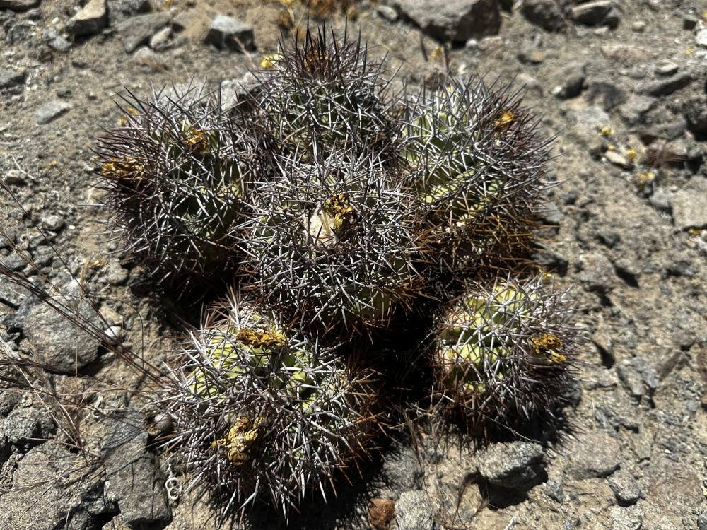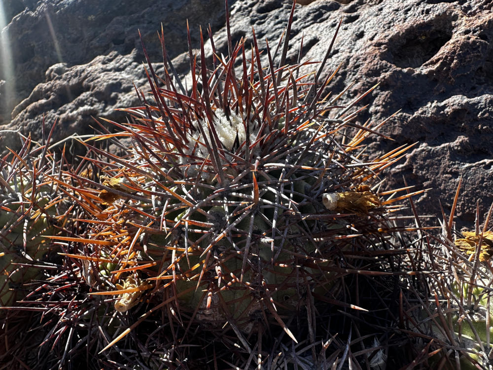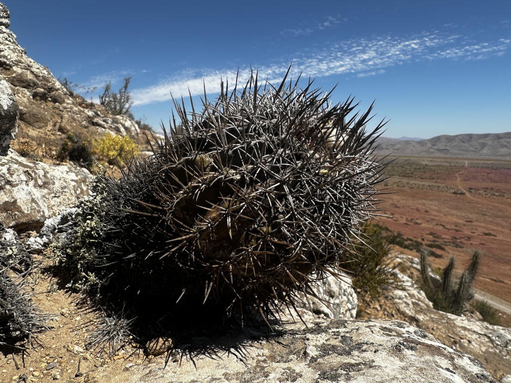 Danach geht es in ein Tal östlich von Vallenar zu einem Standort von Copiapoa rubispina. Schöne Pflanzen, sie ziehen sich über einen ganzen Berghang. Im Gegenlicht sieht man gut, woher sie ihren Namen haben.