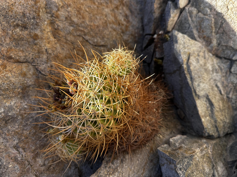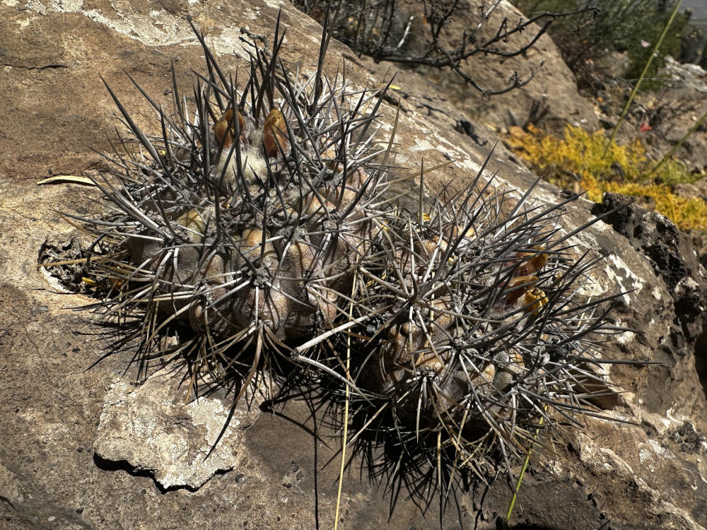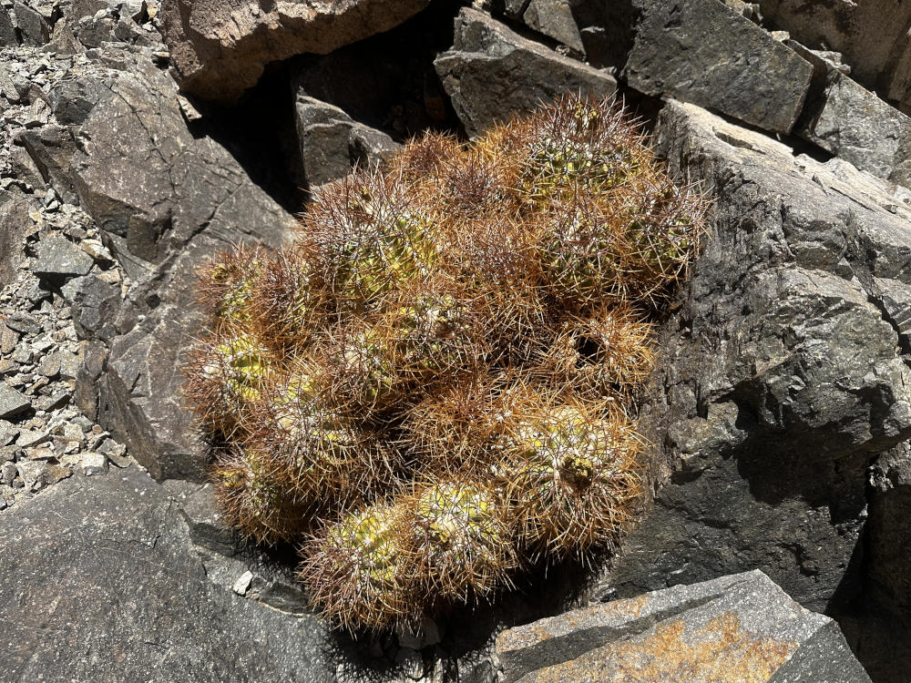 Anschließend fahren wir weiter nach Norden und biegen nach Osten ab in ein Seitental. Bei El Donkey finden wir die ersten Copiapoa andina. Die Pflanzen stehen in einem steilen Felshang und sind von der Straße aus nicht zu sehen. Sie sind eher dunkelbraun bedornt. Nach vielen Fotos fahren wir weiter rein in das Tal. Die Farben der Felsen und der Untergrund wechseln. Irgendwann kann man aus dem Auto heraus gelbe Polster in den Felswänden erkennen. Es sind ebenfalls Copiapoa andina, aber hier eher gelbbraun bedornt. sehr schöne Pflanzen. Sie stehen in fast senkrechten Felsen, es ist eine ganz schöne Kletterei um an die Pflanzen heran zu kommen.