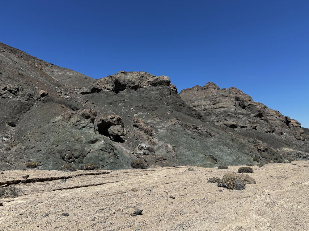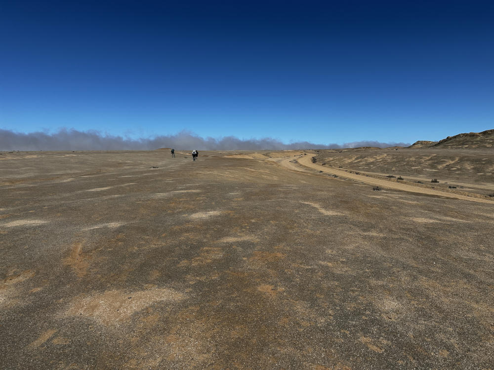 Bei dieser Wanderung ist es faszinierend zu sehen, wie sich die unterschiedlich gefärbten Gesteinsformationen abwechseln. Nach ca. 5 km sind wir an der 2. Schranke angekommen und nach kurzer Rast geht es weiter. Wir laufen jetzt über eine Art Hochplateau, in der Ferne kann man die ersten Wolkenformationen sehen. Wir finden vereinzelt, tief im Boden versteckt Copiapoa esmeraldana und sehen ab und an kleine Echsen.