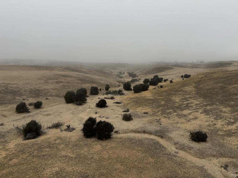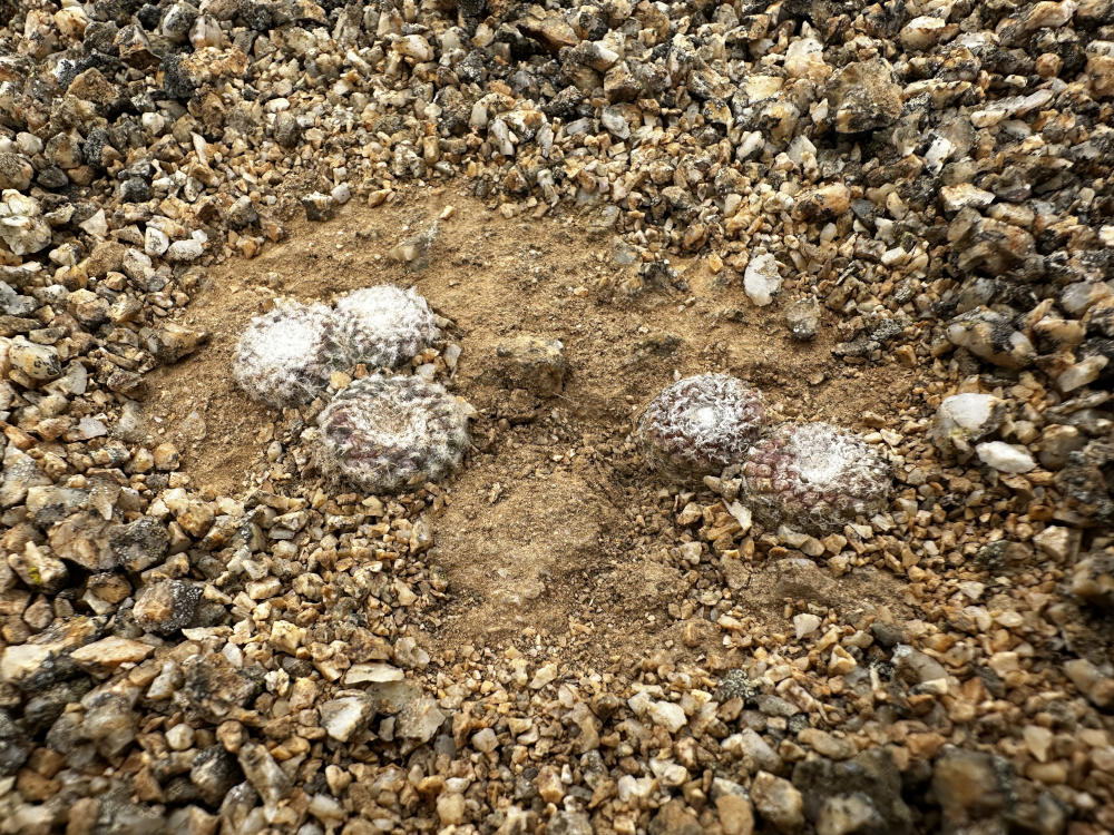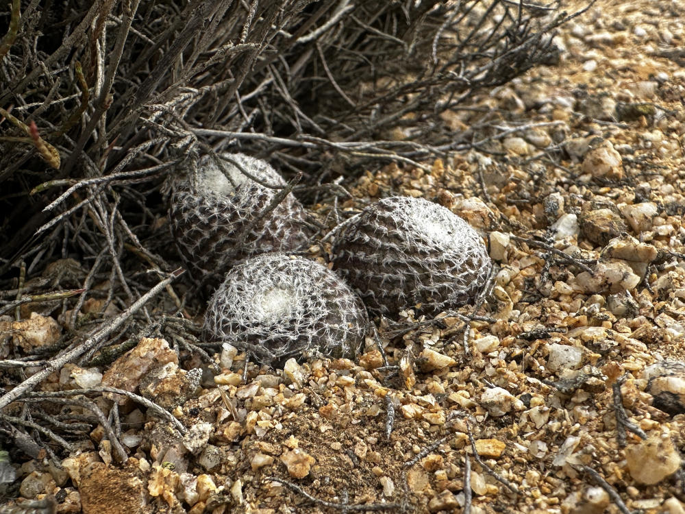 Die Wolken kommen immer näher und es tauchen einzelne, stark mit Flechten behangene Eulychnias auf. Wir laufen weiter und kommen in ein Gebiet mit Hügeln aus hellem und festen Granitgrus. Irgendwann kommen wir endlich bei den gesuchten Pflanzen an. Es handelt sich um Copiapoa laui ssp. adriannae. Es sind im Grunde C. laui, die aber nicht sprossen und damit solitär bleiben. Die kleinen und gut im Boden versteckten Pflanzen sind nicht leicht zu finden. Mittlerweile sind die Wolken soweit hereingezogen, das wir uns im Nebel befinden, die Sicht wird immer schwieriger. Nach vielen Fotos machen wir uns auf den Rückweg mitten durch die Wolken.