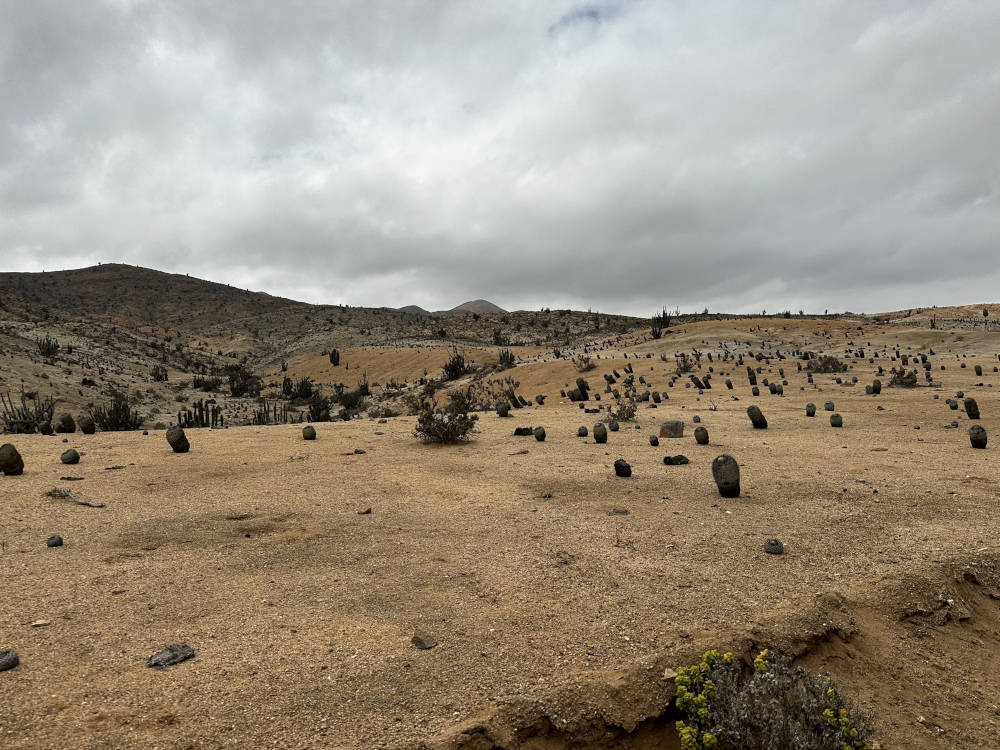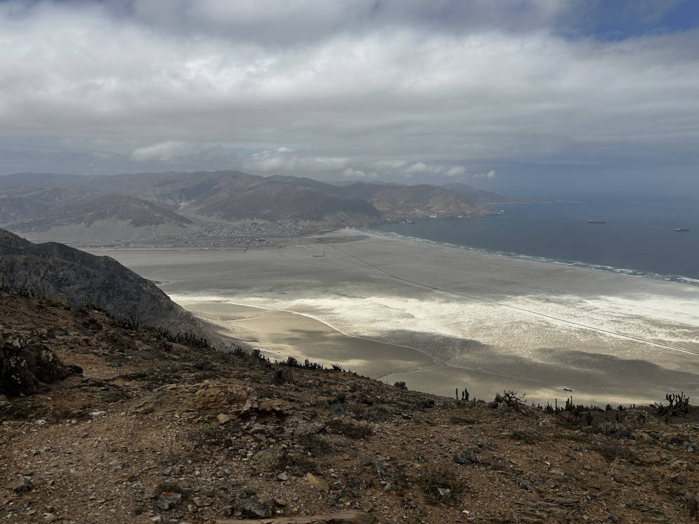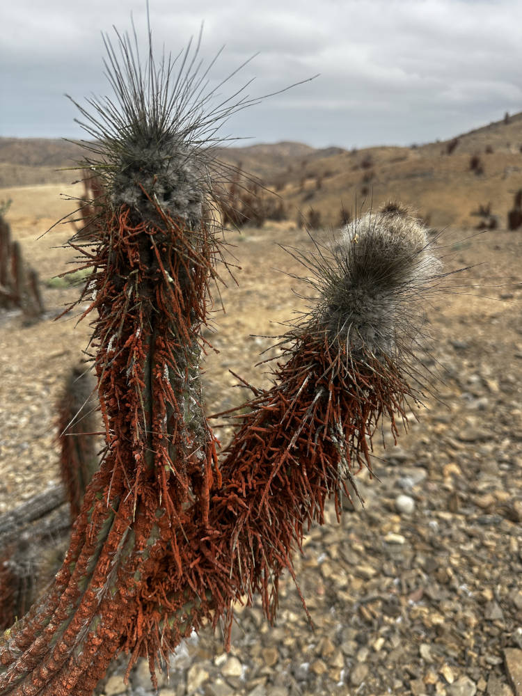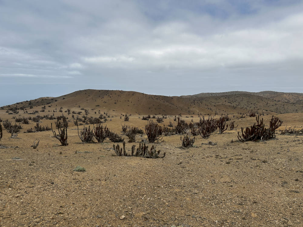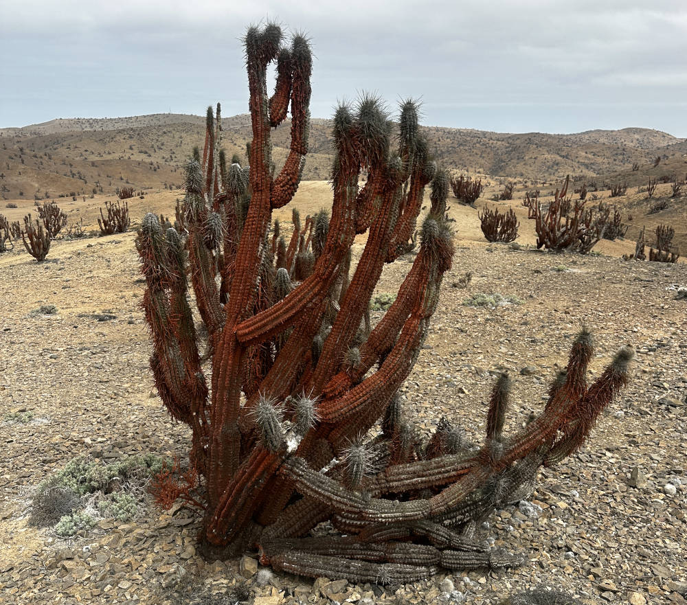 Irgendwann sind wir am (Zwischen-)Ziel angekommen. Schon seit einiger Zeit sind wir durch eine Gegend gefahren, in der fast ausschließlich Eulychnien stehen. Die Pflanzen sind besetzt mit roten Flechten und/oder Pilzen. In Richtung Westen kann man den Pazifik und in der Ferne Chañaral sehen.