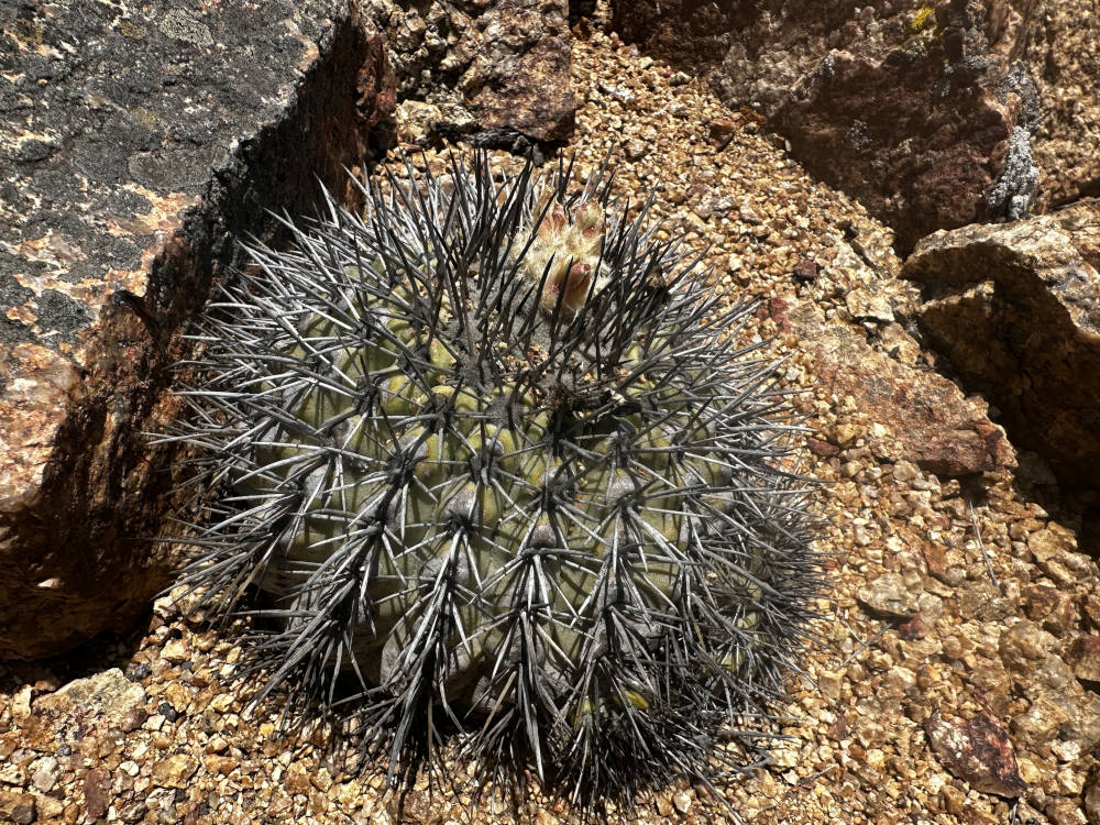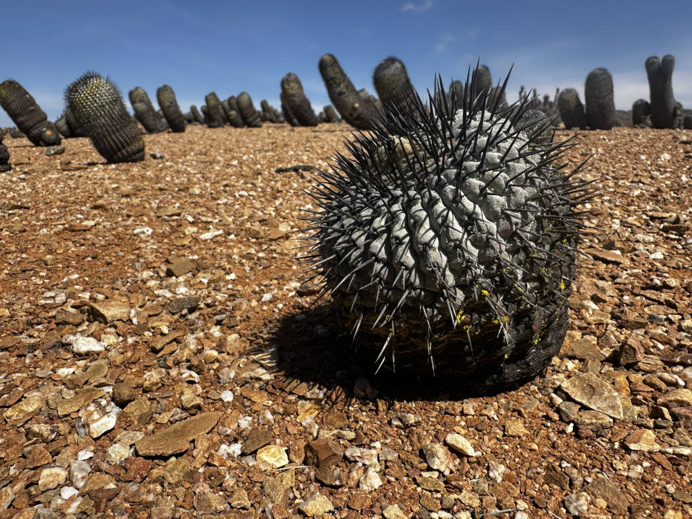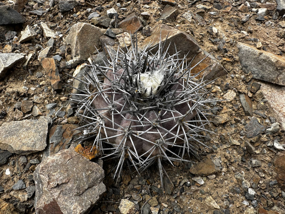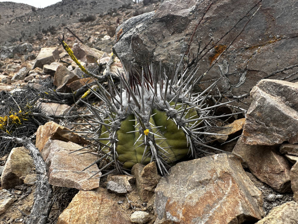 Es geht sehr lange und auf beschwerlichem Weg durch ein Tal. Am Rande tauchen die ersten Eulychnien und Copiapoa columna-alba auf. An einer bestimmten Stelle halten wir an und steigen für eine ausgiebige Fototour aus. Es ist noch früh am Tag und der Himmel ist bewölkt, von daher ist das Licht für gute Fotos nicht optimal. Hier finden wir Copiapoa columna-alba mit schwarzen und weißen Dornen an der gleichen Pflanze. Es scheint eine Art Übergangsform zu sein, auf jeden Fall sehr beeindruckende Pflanzen. Gemeinsam mit diesen kommt hier Copiapoa bridgesii vor, allerdings nur mit sehr wenige Pflanzen. Nach vielen Fotos fahren wir weiter in Richtung Süden, durch eine Gegend mit Millionen von Copiapoa columna-alba. Die Pflanzen stehen hier soweit das Auge reicht, bis an den Horizont.