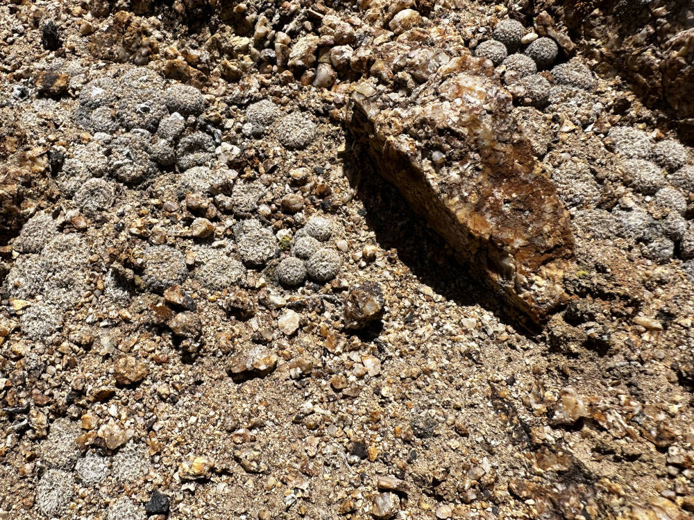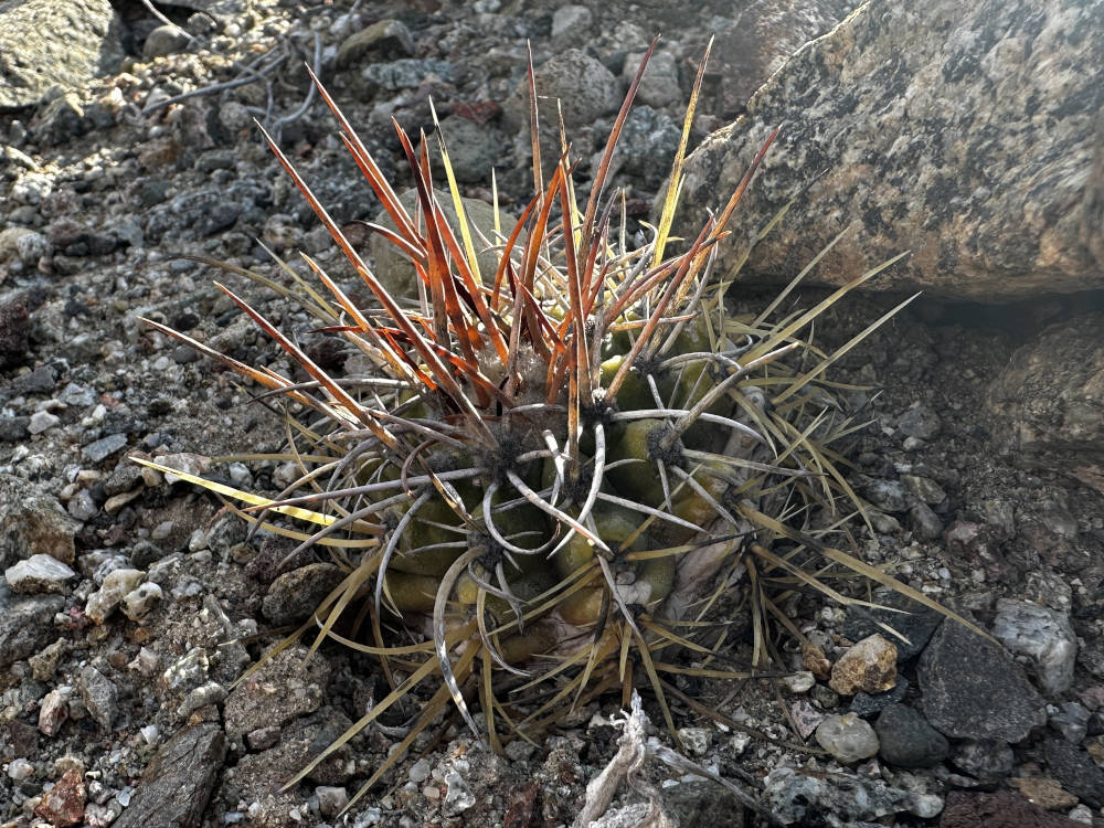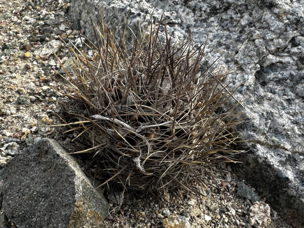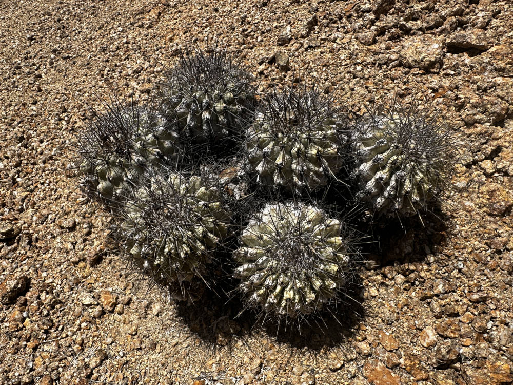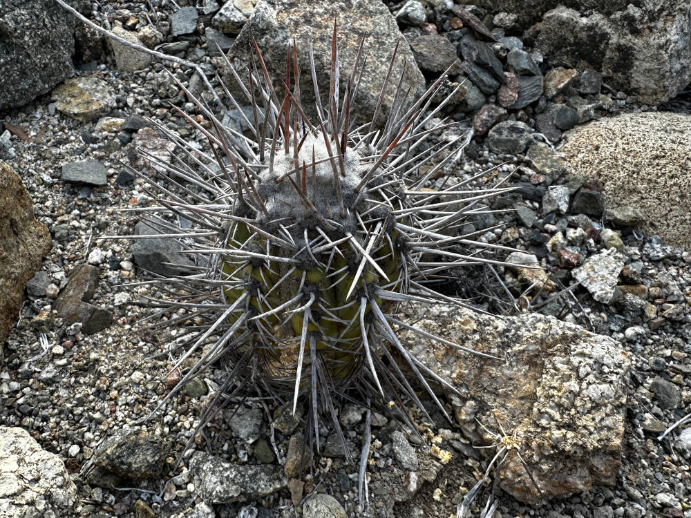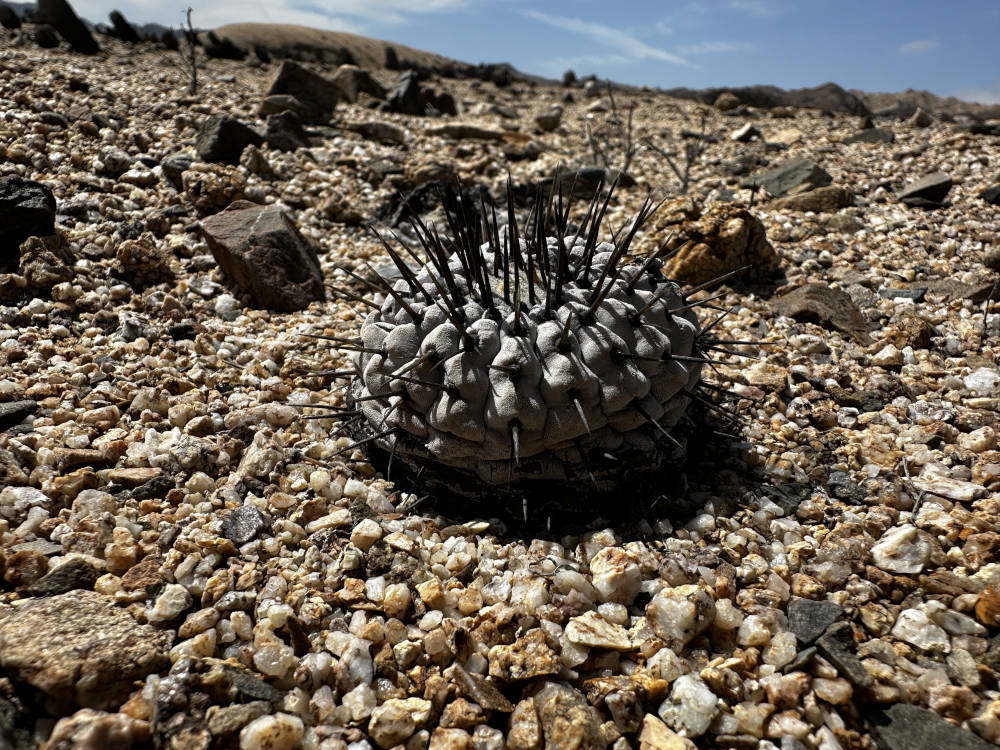 Weiter oben in den Hängen lassen sich Copiapoa laui finden, aber auch nur wenn man weiß wo genau die wachsen. Die winzigen Pflanzen stehen in purem Granit. Es braucht eine Weile bis sich das Auge angepasst hat, aber danach entdeckt man immer mehr Pflanzen. Unglaublich wieviele Pflanzen da auf einem Fleck stehen, quasi wie in der Pikierkiste. Beeindruckend auch, wie klein die Pflanzen hier sind. Die einzelnen Köpfe haben einen Durchmesser von unter 10 Millimeter. Außerdem soll hier Copiapoa angustiflora vorkommen. Wir suchen länger, aber mehr als eine Pflanze finden wir nicht.