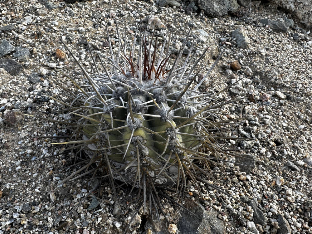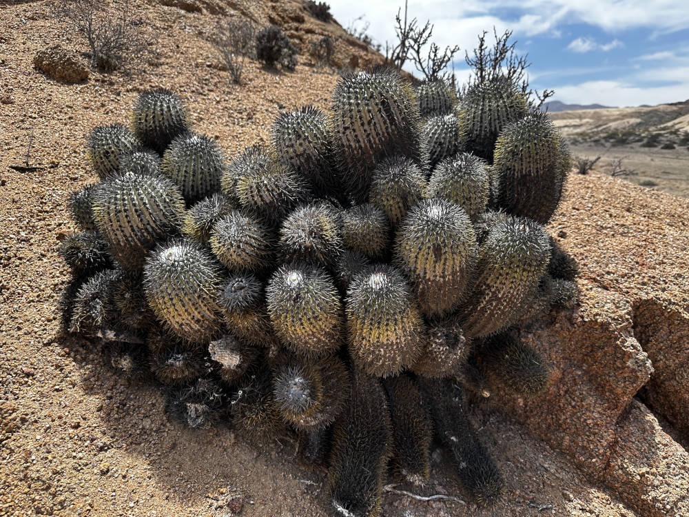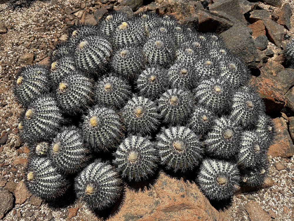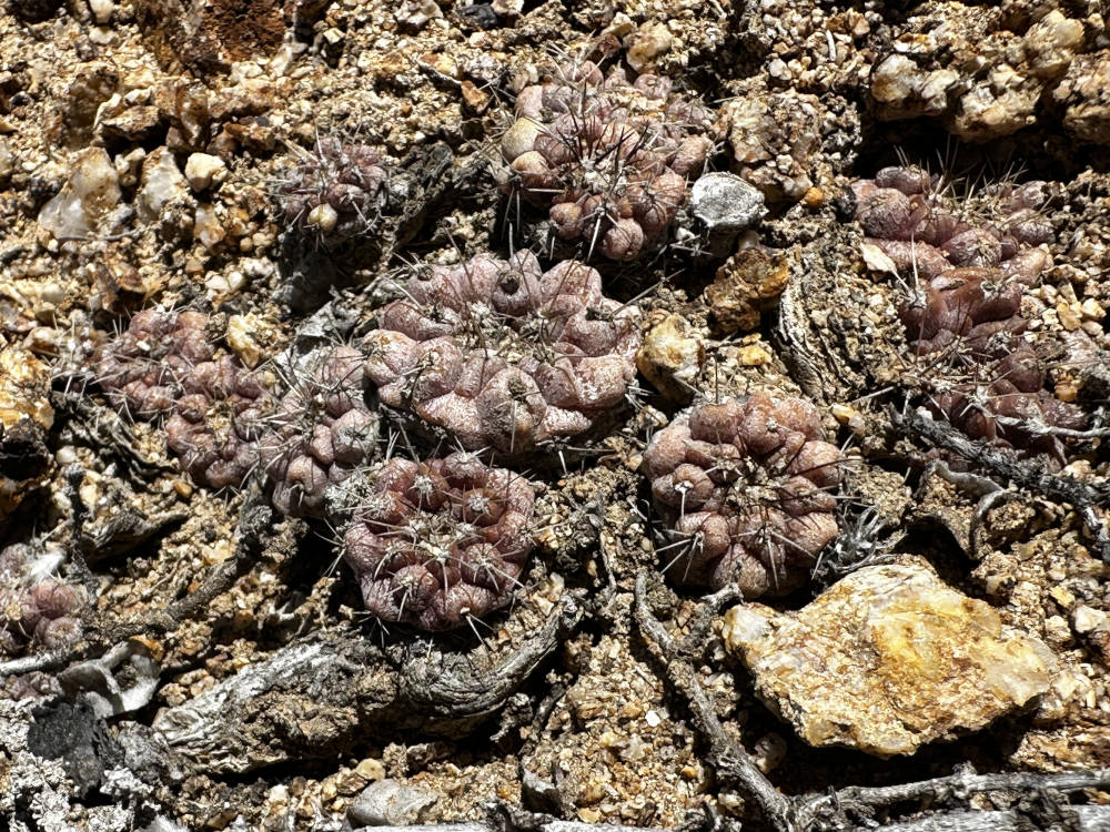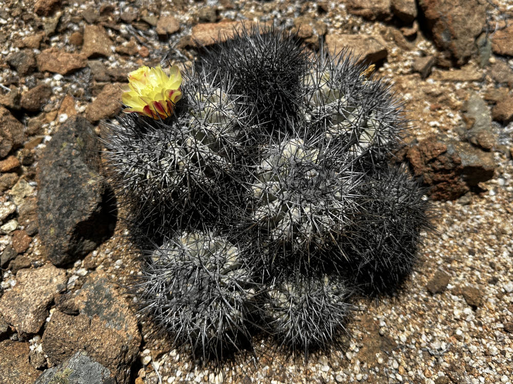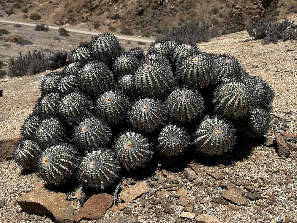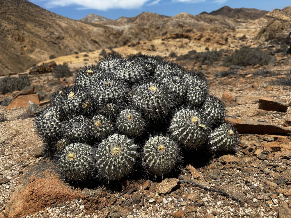 Auch von diesem Standort müssen wir uns nach reichlich Fotos verabschieden und fahren weiter. Aber nicht sehr weit, wir biegen ab in die Quebrada Las Lozas. Dort lassen sich u.a. ebenfalls wieder C. grandiflora und auch wieder C. longistaminea finden. Beide Arten bilden hier riesige Polster aus, der Anblick ist sehr beeindruckend. Aber wir finden auch große Polster, die vollständig abgestorben sind. Die C. longistaminea stellen sich sehr unterschiedlich dar, es gibt Pflanzen mit gräulich-grauer Epidermis und auch welche, die mehr grünlich-graue Körper haben. Auch die Bedornung geht von relativ lange Dornen bis hin zu ganz kurzen Dornen.