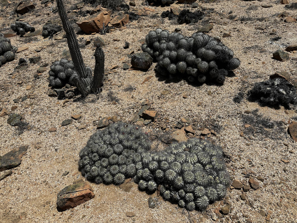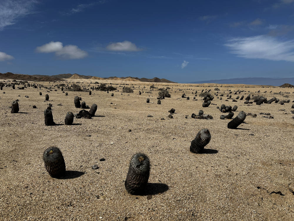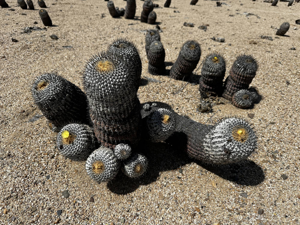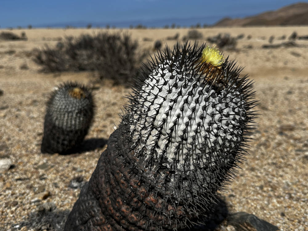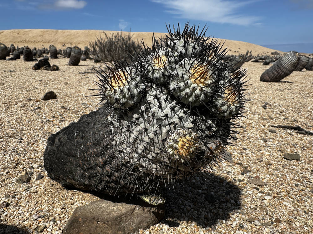 Und weiter geht es an der Küste entlang und später wieder ins Landesinnere. Wir biegen ab in die Quebrada de la Cachina und kommen bald an einen der bekanntesten Copiapoa-Hotspot. Südlich der Straße stehen Copiapoa columna-alba zu Millionen. Wunderschöne Pflanzen, manche sogar in Blüte. Man findet alle Altersklassen an Pflanzen, uralte Exemplare ebenso wie auch Jungpflanzen, schön zu sehen, das die Reproduktion funktioniert.