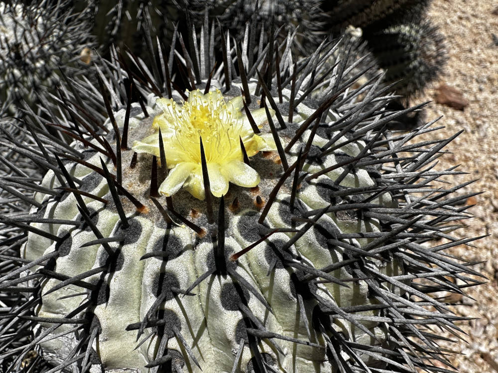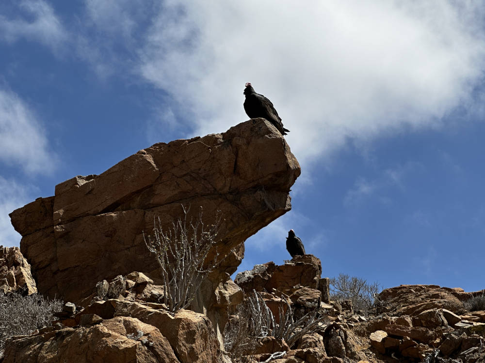 Nach sehr vielen Fotos fahren wir weiter und halten kurz darauf wieder an. Wir laufen weiter zu Fuß in der Quebrada de la Cachina Richtung Westen. Schon bald lassen sich in den Hängen rechts und links reichlich Copiapoa grandiflora und wenige Copiapoa longistaminea finden. Ein paar der C. grandiflora sind auch am blühen, mit beeindruckend großen Blüten, was den Artnamen ja begründet hat. Beim fotografieren werden wir von ein paar Truthahngeiern beobachtet, die etwas oberhalb auf den Felsen sitzen.