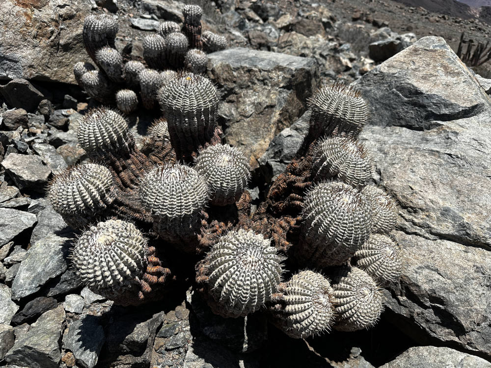 Wir fahren durch eine Gegend mit endlosen Feldern von Copiapoa cinerea. Am Ende eines Weges stellen wir unsere Fahrzeuge ab und laufen zu Fuß weiter. Es geht durch eine Gegend mit unterschiedlich gefärbten Gesteinen und Copiapoa cinerea begleitet uns fast den gesamten Weg. Die Landschaft ist ein wenig unwirklich, aber beeindruckend schön.